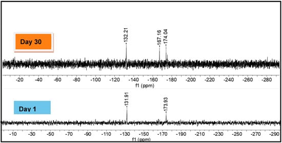 A solid powder sample of 15 was left exposed to ambient conditions (21 °C, relative humidity ≈ 65%, natural light) for 30 d to test its long-term stability. A 119Sn NMR spectrum obtained after 30 d of exposure (Figure 5) was compared to the sample t = 0. A new, and as yet unassigned, signal at −167.2 ppm indicates that some degradation of 15 occurs in the solid state under these conditions. However, both the open and closed resonances attributed to polymer 15 are still present in significant concentration after this evaluation, which is a considerable improvement compared to 4-coordinate polystannanes, which typically degrade readily (<1 h) after exposure to similar conditions [31,32,33].