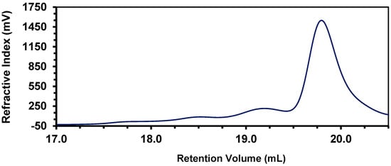 A molecular weight determination (GPC) for 15 prepared with a 4 mol% catalyst revealed a trimodal distribution. Analysis of the largest peak in the GPC indicates that it has a relatively low molecular weight (11,200 Da, Ð = 2.90, Figure 6). A more narrowly distributed, slightly higher molecular weight of polymer 15 was obtained using the 2 mol% catalyst loading (Mw ≈ 20,000 Da, Ð = 1.8).
