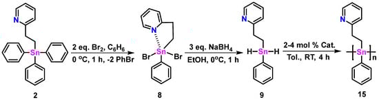 - Imori, T.; Lu, V.; Cai, H.; Tilley, T.D. Metal-Catalyzed Dehydropolymerization of Secondary Stannanes to High Molecular Weight Polystannanes. J. Am. Chem. Soc. 1995, 117, 9931–9940. [Google Scholar] [CrossRef]