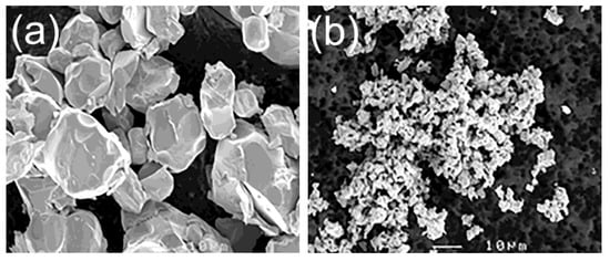The images of the Sm2Fe17 alloy powder and Sm2Fe17N3 powder are shown in Figure 1. The Sm2Fe17 alloy powder was made using the diffusion reduction process [22]. The Sm2Fe17 alloy powder was a coarse powder with an average particle size of about 30 μm. The Sm2Fe17N3 powder was first made by nitrogenation of the Sm2Fe17 alloy powder and then pulverized into fine powder. The average particle size of the Sm2Fe17N3 powder was about 3 μm. The fine Sm2Fe17N3 powder was used in this study.