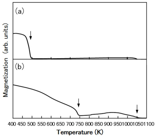 Thermomagnetic curves of (a) Sm2Fe17 alloy powder and (b) Sm2Fe17N3 powder. The arrows indicate the magnetic transition temperature.