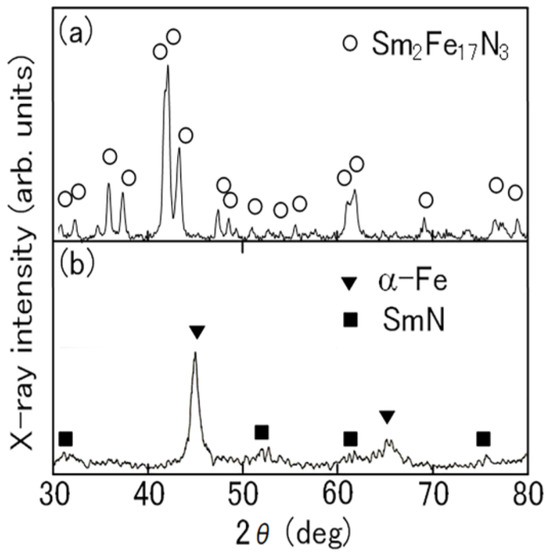 In order to confirm the decomposition of the Sm2Fe17N3 powder, the specimen after the thermomagnetic measurement was examined using X-ray diffraction. The result is shown in Figure 4. No diffraction peaks of the Sm2Fe17N3 phase were seen in the X-ray diffraction pattern. Instead, diffraction peaks of the α-Fe and SmN phases were noticed in the X-ray diffraction pattern. This confirms that the Sm2Fe17N3 phase decomposes into the α-Fe and SmN phases during thermomagnetic measurement.