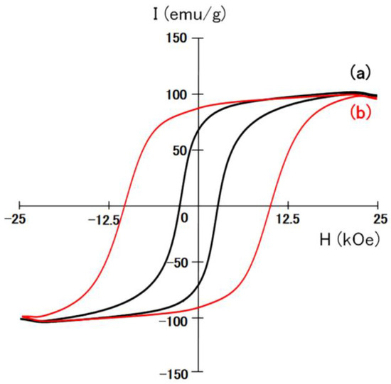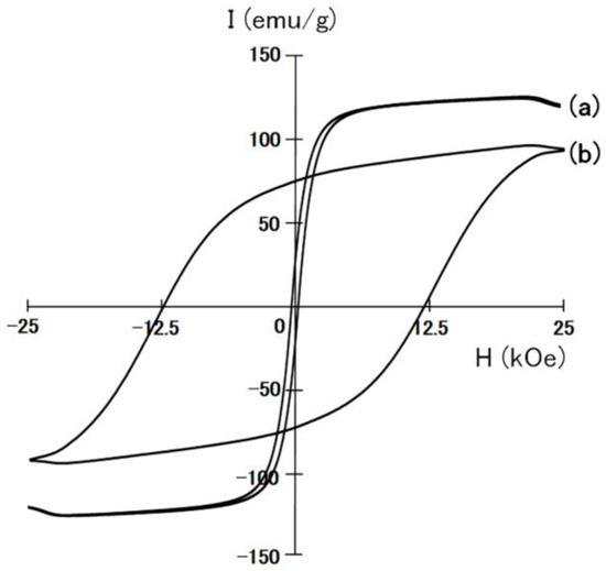 Figure 5 shows the hysteresis loops of the Sm2Fe17 alloy powder and the Sm2Fe17N3 powder. The Sm2Fe17 alloy powder showed a narrow hysteresis loop, but the Sm2Fe17N3 powder exhibited a wide one. This indicates that the Sm2Fe17 alloy powder without nitrogenation did not display large coercivity. On the other hand, Sm2Fe17N3 powder, prepared by nitriding the Sm2Fe17 alloy powder, exhibited a large coercivity. The Sm2Fe17N3 powder exhibits a large coercivity of 12.4 kOe with a remanence of 75.3 emu/g.
