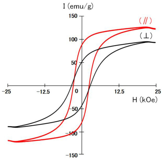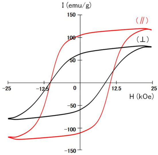 Hysteresis loops of the Sm2Fe17N3 bulk magnets with 1 wt% zinc stearate powder measured parallel (//) and perpendicular (⊥) to the direction of the magnetic alignment. In the hysteresis measurements, rod-like specimens (1 × 1 × 10 mm) were cut from the magnets to avoid demagnetization correction.