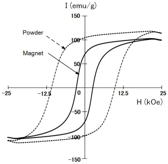 Compared with the hysteresis loop of the Sm2Fe17N3 powder (see Figure 6), the remanence and coercivity of the Sm2Fe17N3 bulk magnets with 1 wt% zinc stearate powder were slightly smaller than those of the Sm2Fe17N3 powder. Thus, further work is still necessary to improve the magnetic properties of the Sm2Fe17N3 bulk magnets.