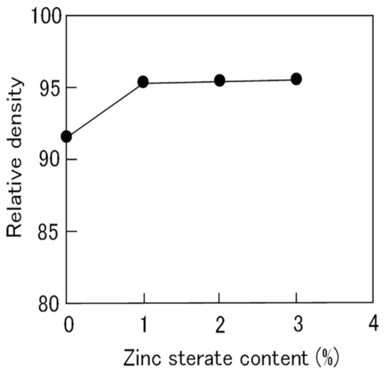 As remanence is related to the magnetic alignment of the powder in the magnet, small amounts of sintering aid powder were added to the Sm2Fe17N3 powder before magnetic alignment, and its effects on the magnetic properties of the magnets were examined. In this study, various sintering aid powders, such as graphite and silica powders, were applied for this purpose. It was found that the zinc stearate powder could improve the density and magnetic alignment of the Sm2Fe17N3 powder. The effects of zinc stearate powder addition on the relative density of the Sm2Fe17N3 bulk magnets are shown in Figure 10. The relative density of the Sm2Fe17N3 bulk magnet increased from 91.7% to 95.8% as the zinc stearate content increased. Although the density of the zinc stearate powder was 1.095 g/cm3, much smaller than that of the Sm2Fe17N3 powder (7.66 g/cm3), the zinc stearate powder drastically improved the density of the Sm2Fe17N3 bulk magnet. The resultant Sm2Fe17N3 bulk magnet with small amounts of zinc stearate powder had a high density of over 95%.