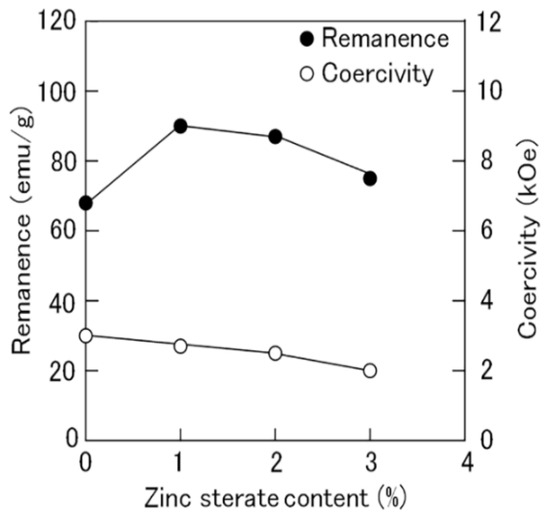 Figure 11 shows the effects of zinc stearate powder addition on the remanence and coercivity of the magnets. The remanence significantly increased but then decreased as the amount of zinc stearate powder was increased. In contrast, the coercivity gradually decreased as the amount of zinc stearate increased. This confirms that the addition of zinc stearate powder before magnetic alignment improved the magnetic alignment of the Sm2Fe17N3 powder.