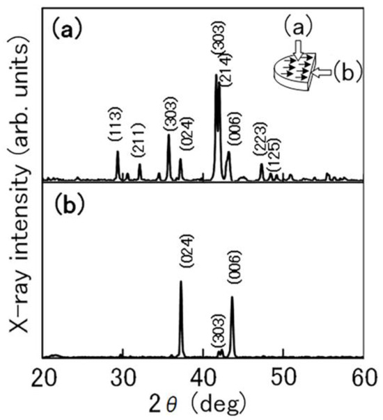 X-ray diffraction patterns of the Sm2Fe17N3 bulk magnet with 1% zinc stearate powder measured (a) perpendicular to the magnetic alignment and (b) parallel to the direction of magnetic alignment. The black arrows in the Sm2Fe17N3 bulk magnet indicate the magnetic alignment of the Sm2Fe17N3 powder.