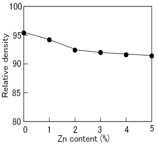 As the coercivity of the magnets was improved by adding a small amount of Zn [20,21], zinc powder and 1% zinc stearate powder were added to the Sm2Fe17N3 powder before magnetic alignment. Consequently, the effects of this addition on the density and magnetic properties of the magnets were examined. Figure 14 shows the effects of zinc powder addition on the relative density of the Sm2Fe17N3 bulk magnets with 1% zinc stearate powder. Unlike in the case of the zinc stearate powder addition, the relative density of the Sm2Fe17N3 bulk magnets decreased from 95.4% to 91.5% as the zinc content increased. This indicates that the addition of zinc powder deteriorated the density of the Sm2Fe17N3 bulk magnets with 1% zinc stearate powder.