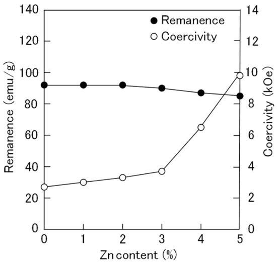 Figure 15 shows the effects of zinc powder addition on the remanence and coercivity of the Sm2Fe17N3 bulk magnets. Since the 1 wt% zinc stearate powder addition effectively increased the magnetic alignment of the Sm2Fe17N3 powder, the Sm2Fe17N3 bulk magnets with 1 wt% zinc stearate powder were used as the base magnet. While the remanence slightly decreased as the amount of zinc powder increased, the coercivity considerably increased with increasing amounts. This verifies that the addition of zinc powder before the magnetic alignment improved the coercivity of the magnets.