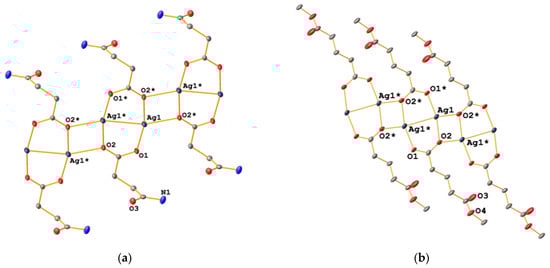These silver carboxylates are all colourless solids, which appear to be light-stable for several weeks. As is typical for silver salts, they tend to be poorly soluble or insoluble in common solvents. Some of the complexes reported here are, however, slightly soluble in hot water, out of which they crystalize or precipitate on cooling. An exception seems to be the succinic acid monomethyl ester salt (3), which is quite soluble in water even at room temperature, allowing us to record proton- and carbon-NMR spectra. In addition, IR spectroscopy was used to characterize compounds 1–6. Most diagnostic are the signals in the carbonyl region of the spectrum, where we could identify the C=O band of the amide, ester or ketone as well as the asymmetric and the symmetric OCO bands of the carboxylate group. In principle, the difference between the asymmetric and symmetric OCO bands (Δ) of a carboxylate group can be used to identify its coordination mode [8,9]. However, the method is of course only reliable when both bands can be unambiguously identified, which is often not trivial. In complexes 1–6, the values for Δ range from 120 to 190 cm−1, consistent with a bridging, bidentate coordination mode. Similar values have been reported by others for structurally related silver carboxylates [10]. In addition, we were able to determine the molecular structures of [Ag{O2C(CH2)2C(O)NH2}]n (2) and [Ag{O2C(CH2)3C(O)OMe}]n (4) by single-crystal X-ray diffraction experiments, which indeed confirmed the bridging bidentate O,O-coordination mode (Figure 2).