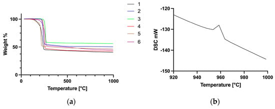 TGA traces of complexes 1–6 (a) and an expansion of the DSC scan of 5, showing the endothermic peak corresponding to the melting of metallic silver (b).
