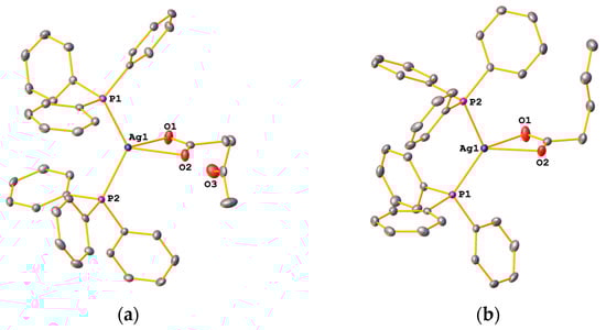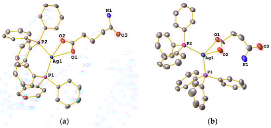 In other silver(I) bis(triphenylphosphine) carboxylate complexes including [(Ph3P)2Ag{O2C(CH2)nMe}] (n = 13, 16) and [(Ph3P)2Ag(O2CCH2tBu)], similar values are found [16,18,19]. It should be noted that in the structure of compound 2a (Figure 5b), the succinic acid monoamide group is disordered over two positions, resulting in two slightly different long Ag-O distances (2.53 and 2.63 Å). One would be tempted to suggest that in one position the succinate is O,O-chelating, whilst in the other it is O-monodentate. However, this is not the case: in structures where the carboxylate ligand is monodentate, the long Ag-O distances are greater than 2.9 Å.