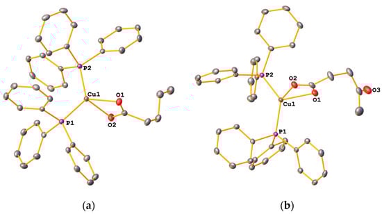 In the solid state, these copper(I) compounds are stable towards oxidation but solutions turn green-blue after several days. The diamagnetic species could be characterized by NMR spectroscopy as well as IR spectroscopy and X-ray diffraction. In the 31P-NMR spectra of 7a and 8a, singlet resonances are observed with chemical shifts of around −2.9 ppm. Similar chemical shifts have been reported for bis(triphenylphosphine) complexes containing ethylene glycol-functionalized carboxylates [20]. From the proton NMR spectra, a 2:1 ratio of phosphine to carboxylate ligands is evident. Furthermore, IR data suggest an O,O-chelating coordination mode of the carboxylate ligands, which was confirmed by X-ray diffraction. The molecular structures of 7a and 8a (Figure 9) are quite similar and will be discussed together.