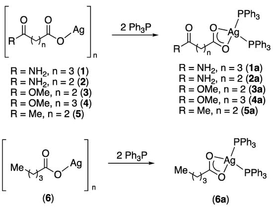 Since these silver carboxylates are poorly soluble or insoluble in most solvents, they were converted into their respective bis(triphenylphosphine) complexes. The silver carboxylates readily dissolve in CH2Cl2 solutions containing two equivalents of Ph3P to afford the bis(phosphine) complexes [(Ph3P)2Ag{O2C(CH2)nC(O)R}] (n = 2 or 3; R = NH2, OMe, Me) 1a–5a and [(Ph3P)2Ag{O2C(CH2)3Me}] (6a) (Scheme 2).