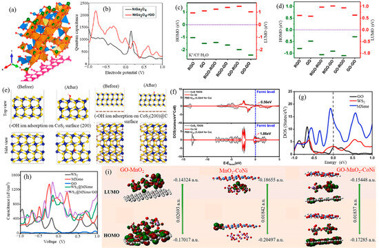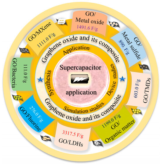 Recently, reviews on using graphene and GO-based composites in supercapacitor applications, including GO, AC/graphene, graphene/vanadium, graphene-based gels, graphene/nano cellulose, graphene/metal oxide, GO/MXenes, metal oxide/rGO, rGO/cellulose, iron oxide/graphene, rGO/polypyrrole, GO/MOFs, LDHs/rGO, GO-based aerogels, and poly(cyclotriphosphazene)/GO, have been published [15,49,60,61,62,63,64,65,66,67,68,69,70,71,72,73,74,75]. In contrast, this review focuses on several types of materials, including metal oxides, metal sulfides, metal chalcogenides, MOFs, and MXene composites with GO, as well as fluorine, bacteria, and other organic functionalization with GO. It discusses their synthesis, as well as their surface, structural, and morphological properties for supercapacitor applications. GO-based composites’ synthesis conditions, time, and cost were thoroughly provided. In addition, their Cs, resistances, rate capability, cycle stability, energy, and power density for the application of supercapacitors were discussed, and the electrochemical results of the various GO composites utilizing three- and two-electrode setups were tabulated for the reader’s ease of access. To assist researchers in examining the properties of electrode materials for use in supercapacitors, earlier work using DFT calculations is also reviewed. Figure 2 shows the maximum Cs of GO and its composite made of various materials for application in supercapacitors, as measured by GCD in recent studies.