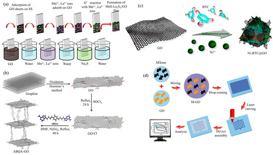 (a) Fabrication process of MnS-La2S3/GO film (reproduced from [100]). Copyright 2023, Elsevier. (b) Synthesis scheme for ABQA-GO composite (reproduced with permission from [101]). Copyright 2023, Elsevier. (c) The schematic diagram for the synthesis of Ni-BTC@GO composite (reproduced from [102]). Copyright 2023, American Chemical Society. (d) Fabrication of GO-MXene composite electrode (reproduced with permission from [103]). Copyright 2023, American Institute of Physics.