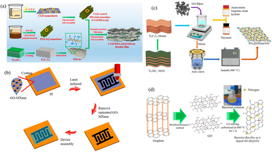 (a) Schematic diagram of the synthesis of CGO/PDAAQ/MXene (reproduced with permission from [117]). Copyright 2023, Elsevier. (b) GO-MXene composite electrode (reproduced with permission from [118]). Copyright 2023, Elsevier. (c) WS2@MXene/GO composite (reproduced with permission from [119]). Copyright 2023, Elsevier. (d) Bacteria/GO (reproduced with permission from [120]). Copyright 2023, Elsevier.