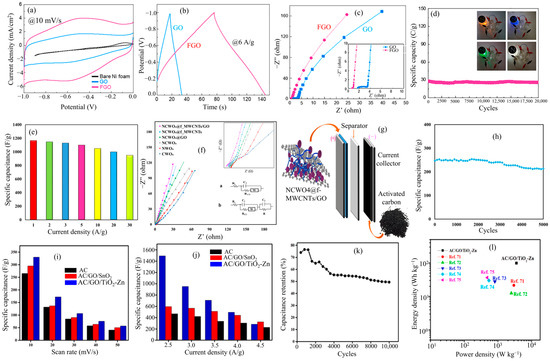 Electrochemical study of electrodes. (a) CV curves of GO and others at 10 mV s−1. (b) GCD curves of FGO and GO at 6 A g−1. (c) EIS spectra. (d) Cycle stability of FGO//FGO device with inset picture shows powering up the LED pulps (reproduced with permission from [77]). Copyright 2023, Elsevier. (e) Variation of Cs for CD of NCWO4/f-MWCNT/GO. (f) EIS spectra of NCWO4/f-MWCNT/GO and others. (g,h) Schematic diagram and cycle stability of NCWO4@f-MWCNTs/GO//AC device (reproduced with permission from [90]). Copyright 2023, Elsevier. (i,j) Variation of Cs to scan rate and CD of AC/GO/TiO2-Zn. (k,l) Cycle stability and the Ragone plot of AC/GO/TiO2-Zn//AC/GO/TiO2-Zn device (reproduced with permission from [79]). Copyright 2023, Elsevier.