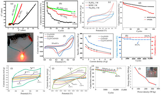 Electrochemical study of (a) EIS spectra of AC/TiO2/GO. (b) Cycle stability of AC/TiO2/GO (reproduced with permission from [80]). Copyright 2023, Elsevier. (c) CV curves of NGO/CuFe2O4 electrode material in different electrolytes. (d) Cycle stability of NGO/CuFe2O4 and others. (e) Two NGO/CuFe2O4//AC in series devices powering up an LED bulb (reproduced with permission from [85]). Copyright 2023, Elsevier. (f) CV curve of Cu2O-CoO/GO and others at 10 mV s−1. (g) Variation in Cs with CD of Cu2O-CoO/GO and others. (h) Cycle stability of Cu2O-CoO/GO//GO device (reproduced with permission from [95]). Copyright 2024, Elsevier. (i,j) CV curves of GO and GO@Fe3O4-IL@W at various scan rates. (k) Cycle stability of GO and GO@Fe3O4-IL@W. (l) Ragone plot and inset picture shows powering up of the LED pulp using GO@Fe3O4-IL@W (reproduced with permission from [58]). Copyright 2023, Elsevier.