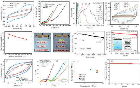 Electrochemical analysis of (a) CV curves of MnS-La2S3/GO at 100 mV s−1. (b) EIS spectra of MnS-La2S3/GO. (c) Ragone plot of MnS-La2S3/GO//MnS-La2S3/GO device. (d) 211 LEDs were turned on using MnS-La2S3/GO//MnS-La2S3/GO device that had been charged for 30 s (photo image of after 3 s) and discharged (photo image of after 150 s) (reproduced from [100]). Copyright 2023, Elsevier. (e) GCD plots of Co2Ni1-GO. (f) Cyclic stability of Co2Ni1-GO. (g) CV curves of Co2Ni1-GO//AC device. (h) Cycle stability of device at 5 A g−1 (reproduced from [106]). Copyright 2023, Springer Nature. (i) CV curve of ZIF-8/SGO and others. (j) EIS spectra of ZIF-8/SGO and others. (k) Ragone plot of ZIF-8/SGO electrode and (l) cycle stability of ZIF-8/SGO (reproduced from [114]). Copyright 2023, John Wiley & Sons, Inc.