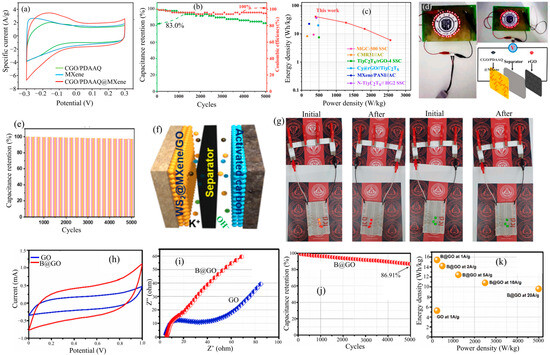 (a) CV curves of CGO/PDAAQ@MXene and other electrodes at 10 mV s−1. (b) Cyclic stability of CGO/PDAAQ@MXene. (c) Ragone plot of the CGO/PDAAQ@MXene//rGO device. (d) Powering up of the LED light by CGO/PDAAQ@MXene//rGO device (reproduced with permission from [117]). Copyright 2023, Elsevier. (e) Cycle stability of WS2@MXene/GO electrode at 10 A g−1. (f) Schematic diagram of the developed WS2@MXene/GO//AC device. (g) Initial and after 20 min lighting of red and green LEDs by the WS2@MXene/GO//AC device (reproduced with permission from [119]). Copyright 2023, Elsevier. (h) CV curve of GO and BGO. (i) EIS spectra of GO and BGO. (j) Cycle stability of BGO. (k) The Ragone plot of BGO (reproduced with permission from [120]). Copyright 2023, Elsevier.