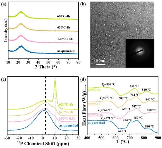 The samples were fabricated via a melt-quenching–thermal annealing route which is easily scalable for mass industrial production. XRD analyses on samples with various heat treatment times at 620 °C all show the amorphous hump coming from the glassy structure (Figure 1a). Transmission electron microscopy (TEM) discloses that the spherical particles of size of 5–9 nm are homogenously distributed among the glass matrix (Figure 1b). The corresponding selected area electron diffraction (SAED) shows a halo ring (a characteristic of an amorphous phase structure), verifying the occurrence of APS. The 31P magic angle spinning nuclear magnetic resonance (MAS-NMR) spectroscopy reveals huge transformation of the local environment surrounding P before/after being heat-treated at 620 °C and illustrates a broad resonance peak which can be well deconvoluted into three sub-bands (originated from Q12, Q11, and Q0 species, respectively) [24,25], as presented in Figure 1c and Figure 2 and Table 1. Qnm is the structural unit of [PO4] (n represents the number of P atoms connected to each [PO4]; m represents the number of Al atoms attached to each [PO4], and m + n ≤ 4). With the annealing time prolonged from 0.5 h to 4 h, Q0 and Q11 species with lots of non-bridging oxygens gradually dominate, which gives evidence of the formation of relative isolated [PO4]-composed groups surrounding Li-rich liquid–liquid immiscibility [26]. Differential scanning calorimeter (DSC) analysis on PG indicates a relatively minor exothermic peak at 645 °C, followed by three distinct and prominent exothermic peaks observed at temperatures of 704 °C, 750 °C, and 825 °C, respectively, while the exothermic peak at 645 °C should be assigned to the APS, since it nearly disappears upon preheating at 620 °C (Figure 1d). Based on more careful observations, with the periods of heat treatment time for APS prolonged, the exothermic peaks (at 704 °C, 750 °C, and 825 °C) slightly shift toward a low temperature. Meanwhile, due to the progressive changes in APS, the glass transition temperature (Tg) increases, which indicates an elevated viscosity and improved glass-forming ability [27]. Combined with the amorphous hump from their X-ray diffraction (XRD) patterns (Figure 1a), a conclusion can be drawn that the APS effect indeed exerts influences on the crystallization kinetics in SAPLZ glass.