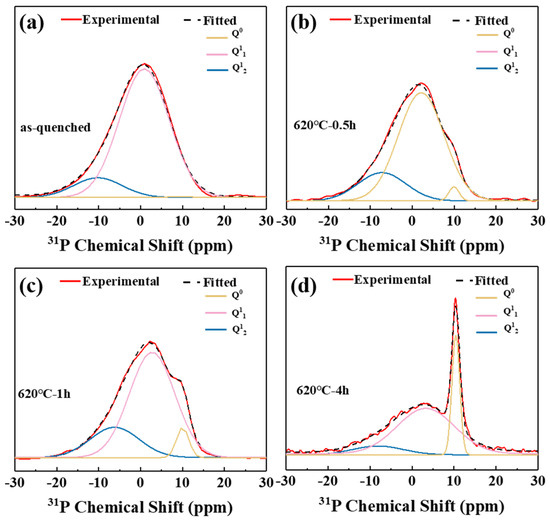 Gaussian fitting of the 31P MAS-NMR spectra of (a) as-quenched PG, (b) 620 °C-0.5 h, (c) 620 °C-1 h, and (d) 620 °C-4 h.