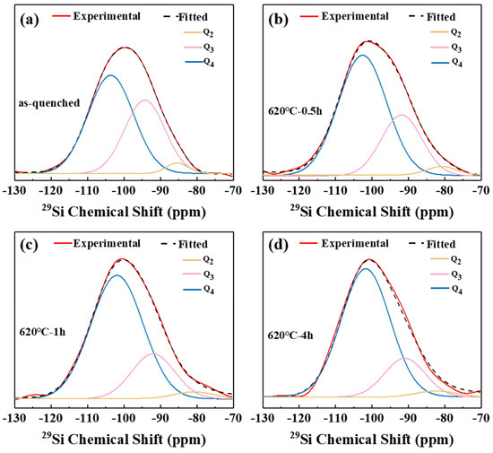 Gaussian fitting of the 29Si MAS-NMR spectra of (a) as-quenched PG, (b) 620 °C-0.5 h, (c) 620 °C-1 h, and (d) 620 °C-4 h.