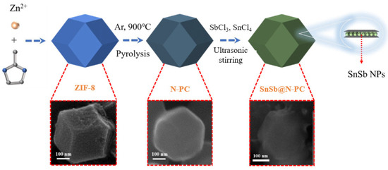 Figure 1 shows the synthesis process of SnSb@N-PC composite. The size of ZIF-8 ranged from 150 nm to 200 nm. The sample was washed with 2.5 mol L−1 dilute HCl solution because Zn2+ was oxidized to Zn during high-temperature pyrolysis. In this process, the disappearance of Zn made a large number of micropores and mesopores appear in the samples (N-PC). Then, SnSb nanoparticles were uniformly distributed in the three-dimensional porous carbon materials using SnCl4 and SbCl3 as raw materials. Subsequently, the composites were characterized, and electrochemical tests were carried out. The corresponding reaction process of SnSb@N-PC is as follows:
