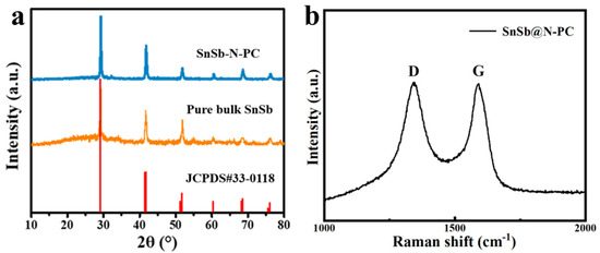 XRD (a) and Raman patterns (b) of SnSb@N-PC composite.