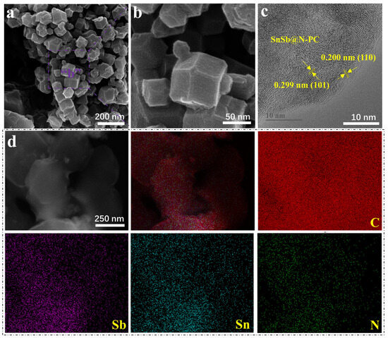 The morphology of SnSb@N-PC composites was characterized by SEM and TEM. According to the scanning electron microscope image of Figure 3a,b, it can be clearly found that the amorphous porous carbon was evenly dispersed on the dodecahedral nanosheets. The HRTEM diagram in Figure 3c presents the selected broken nanocomposite, in which several tens of nanometer-sized SnSb phases were homogeneously distributed throughout the particles. The typical characteristic interlayer shows the spacing of 0.299 nm and 0.200 nm, corresponding to the (1 0 1) lattice and (1 1 0) planes of the SnSb alloy, respectively. The lattice spacing of the short-range ordered pyrolytic carbon (0.34 nm) is not marked in Figure 3c because of the similar spacing of the (0 1 2) crystal face spacing in the SnSb alloy [50,53,56]. It was proven to be stable in MOF-derived carbon. The composite carbon structure can not only improve the conductivity of the material but can also accelerate the diffusion rate of ions, thus enhancing the electrochemical performance of the material [34,59]. Due to the large specific surface area of N-doped three-dimensional porous carbon, SnSb alloy particles can be prevented from accumulating by the limited domain of carbon, so that the grains do not agglomerate and exist in the form of nano-sized small particles. The element distribution diagram of the composite material (Figure 3d) shows that Sb, Sn, and N elements are uniformly distributed in the nanocomposite material, indicating that the MOF-derived nanocarbon material has been successfully doped with heteroatom (N element) during the sample preparation process [75], and the beneficial heteroatom doping is conducive to increasing the active site of the material, thereby improving the sodium storage performance of the material.
