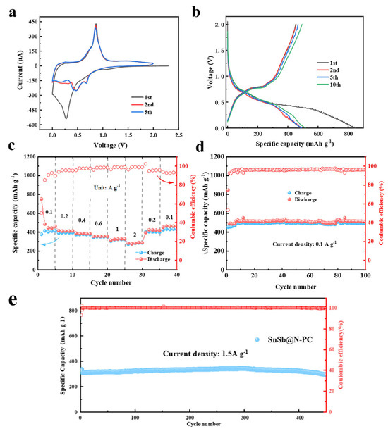 Electrochemical performance of SnSb@N-PC nanomaterials as anodes for sodium ion batteries (a) CV curves for the first, second, and fifth turns. (b) Charge/discharge curves for the first, second, fifth, and tenth turns. (c) Multiplicity performance at 0.1 A g−1–2 A g−1. (d) Cycling performance of SnSb@N-PC at 0.1 A g−1. (e) Cycling performance of SnSb@N-PC at 1.5 A g−1.