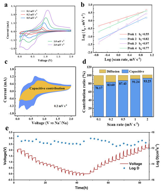 In order to further analyze the kinetics of sodium storage in SnSb@N-PC anode materials, the CV curves of sodium ion batteries were measured at different sweep rates (0.1, 0.2, 0.5, 1.0, 2.0 mV s−1). Figure 5a shows that the shape of the curve did not change obviously with the increase in scanning speed, so SnSb@N-PC had good stability. However, the area of the CV curve increased with the increase in scanning speed, which indicates that there was a capacitive sodium storage behavior on the electrode surface. The behavior of peak current is analyzed by Equation (3) in this paper [76,77].