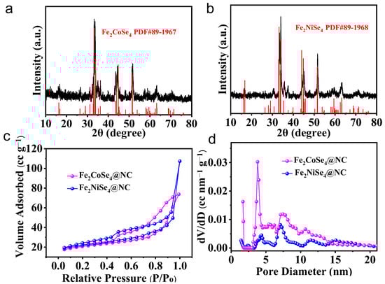 XRD patterns of (a) Fe2CoSe4@NC and (b) Fe2NiSe4@NC. (c) N2 adsorption/desorption isotherms and (d) the corresponding Barret–Joyner–Halenda (BJH) pore size distribution of Fe2CoSe4@NC and Fe2NiSe4@NC.