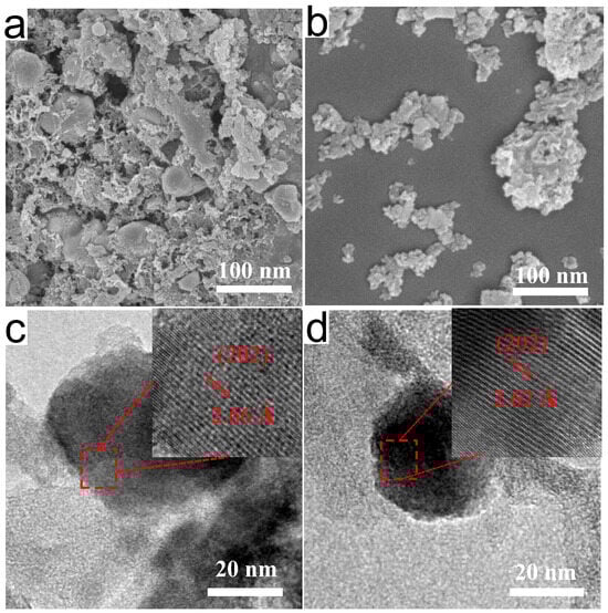 The morphology of the nanocomposites was examined using scanning electron microscopy (SEM), as depicted in Figure 2a,b. In Figure 2a, SEM images of Fe2CoSe4@NC reveal random nanoparticles and nano-blocks, along with small pores on the surface. On the other hand, the SEM image of Fe2NiSe4@NC displays a noticeable agglomeration of nanoparticles (Figure 2b). The high-resolution transition electron microscopy (HRTEM) image of Fe2CoSe4@NC (Figure 2c) shows the calculated lattice spacing of 2.66 Å for (202) plane, which is slightly larger than that of Fe2NiSe4@NC(2.62 Å) (Figure 2d), consistent with the results obtained from the XRD patterns [25].