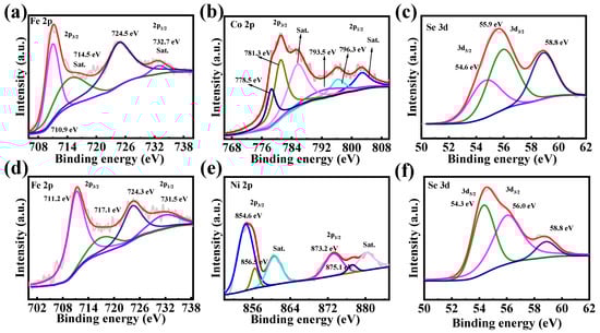 The chemical composition and valence states of elements in Fe2CoSe4@NC and Fe2NiSe4@NC composites were analyzed using X-ray Photoelectron Spectroscopy (XPS). Figure S3 presents the full survey spectra of Fe2CoSe4@NC and Fe2NiSe4@NC, revealing the presence of Fe, Co, Se, C, O, and N elements in Fe2CoSe4@NC, and Fe, Ni, Se, C, O, and N elements in Fe2NiSe4@NC, respectively. The high-resolution Fe 2p spectra of Fe2CoSe4@NC (Figure 3a) and Fe2NiSe4@NC (Figure 3d) exhibit two peaks at 710.9 and 724.5 eV, corresponding to the Fe2+ 2p3/2 and 2p1/2 orbitals [28], respectively, with two satellite peaks (marked with “Sat.”) [29,30]. The Co 2p of Fe2CoSe4@NC (Figure 3b) exhibits peaks at 780.3 and 796.3 eV, which are attributed to the Co2+ 2p3/2 and 2p1/2 orbitals, accompanied with two satellite peaks at 785.9 and 802.8 eV, respectively [31,32,33,34,35]. As depicted in Figure 3e, the high-resolution XPS spectrum of Ni2+ 2p comprises a pair of spin-orbit doublets at 854.6 and 873.2 eV, as well as two satellite peaks [36,37].