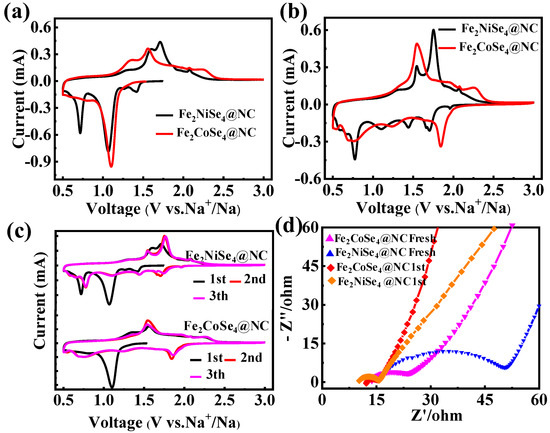 Na-storage properties of the Fe2CoSe4@NC and Fe2NiSe4@NC electrodes as anodes: (a) the first and (b) second cycle of CV curves for Fe2CoSe4@NC and Fe2NiSe4@NC at 0.2 mV s−1 within 0.5~3.0 V; (c) the first three cycles of the CV curves for Fe2CoSe4@NC and Fe2NiSe4@NC; and (d) the EIS spectra of Fe2CoSe4@NC and Fe2NiSe4@NC electrodes before and after cycling at 0.1 A g−1.