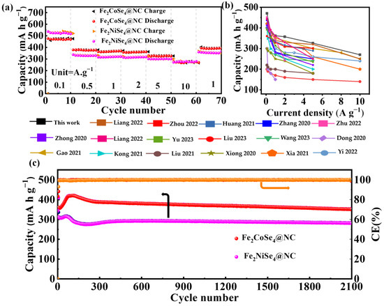 The rate capability of Fe2CoSe4@NC and Fe2NiSe4@NC was evaluated by varying the current densities from 0.1 to 10 A g−1, as depicted in Figure 5a. Fe2CoSe4@NC demonstrates a reversible specific capacity of 470, 378, 362, 357, 326, and 270 mAh g−1 at a current density of 0.1, 0.5, 1, 2, 5, and 10 A g−1, respectively. Similarly, Fe2NiSe4@NC exhibits rate capability, delivering 530, 330, 318, 315, 300, and 270 mAh g−1-specific capacities at the current densities of 0.1, 0.5, 1.0, 2, 5, and 10, respectively. It is observed that Fe2CoSe4@NC exhibits a lower reduction in capacity than Fe2NiSe4@NC with an increase in current density, possibly due to the more robust structure of the former than the latter, which surpasses that of most single transition metal selenides reported in the literature, as illustrated in Figure 5b and Table S1.