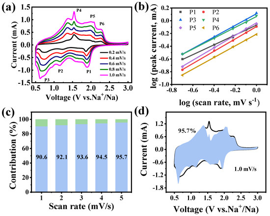 where k1×v and k2×v1/2 represent the pseudocapacitive capacity and diffusion-controlled capacity, respectively. As summarized in Figure 6c, the pseudocapacitive contribution was estimated to be 90.6%, 92.1%, 93.6%, 94.5%, and 95.7% at the scan rates of 0.2, 0.4, 0.6, 0.8, and 1.0, respectively, showing a continuous increase in pseudocapacitive contribution to energy storage of Fe2CoSe4@NC with increasing scan rate. As expected, the pseudocapacitive contribution dominates the charge-storage capacity at higher scan rates, which is beneficial for fast Na+ transfer kinetics during the intercalation/extraction process [8]. Additionally, Figure 6d further illustrates the detailed pseudocapacitive portion (blue region) in comparison with the total current measured at a scan rate of 1.0 mV s−1.