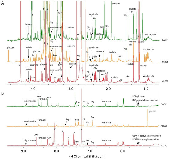 Representative 1H NMR spectra of the endo-metabolome (cell lysates) of A2780 ovarian cancer cells (red trace), GL261 glioblastoma cells (yellow trace), and DAOY medulloblastoma cells (green trace). (A) Upfield (1.00–4.50 ppm) and (B) downfield (5.00–9.50 ppm) regions. The most abundant metabolites that have been identified in the spectra are indicated; for a graphical reason, for each metabolite only one (or more for a few cases) resonance is reported. Abbreviations: phosphocholine (PC); glycerophosphocholine (GPC); glutathione (GHS); ATD/ADP/AMP (AXP); #: signals arising from protease and phosphatase inhibitor cocktails. The samples have been prepared according to the protocol reported in [3].