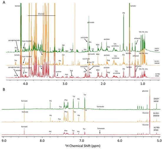 Representative 1H NMR spectra of the exo-metabolome (growth media) of A2780 ovarian cancer cells (red trace), GL261 glioblastoma cells (yellow trace), and DAOY medulloblastoma cells (green trace). (A) Upfield (1.00–4.50 ppm) and (B) downfield (5.00–9.00 ppm) regions. The most abundant metabolites that have been identified in the spectra are indicated; for a graphical reason, for each metabolite only one (or more for a few cases) resonance is reported. The samples have been prepared according to the protocol reported in [3].