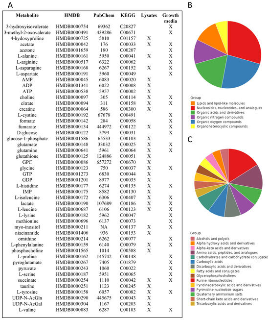 (A) List of detected metabolites in A2780 cells with KEGG and HMDB codes. (B,C) Enrichment analysis results: super (B) and sub-classes (C) classification according to their chemical structure, using the MetaboAnalyst 6.0 software [42].