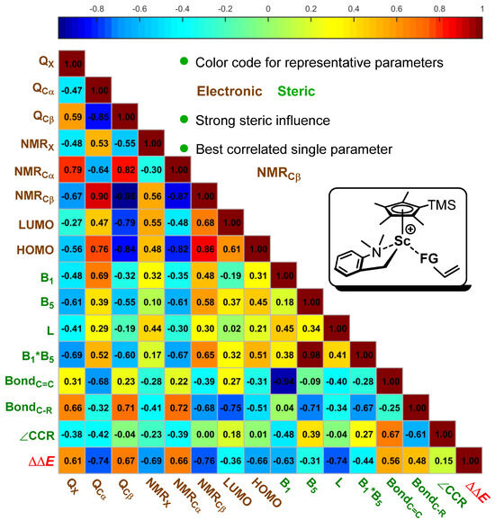 All DFT computations were carried out utilizing the Gaussian 16 software package [44]. All geometry optimizations and frequency calculations were performed using the B3LYP functional [45,46,47], which includes the D3 version of Grimme’s empirical dispersion correction [48,49]. The SDD basis set [50,51,52] was applied for Sc, and the 6-31G(d) basis set was used for nonmetal atoms. To achieve more accurate relative energies, single-point energies were calculated using the M06 functional [53] in combination with a larger basis set (SDD basis set for Sc and 6-311+G (d, p) for the remaining atoms) and the PCM model [54], which was used to account for the solvation effect of toluene. The generation of correlation color maps and the execution of multivariate linear regression analysis were carried out using Matlab software [55]. Furthermore, sterimol parameters were computed on the basis of optimized structures by using the Molecular Modeling Pro software [56].