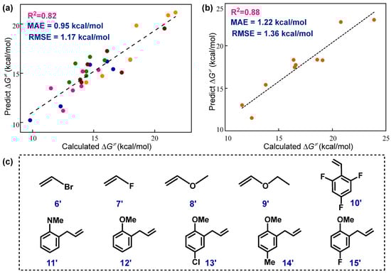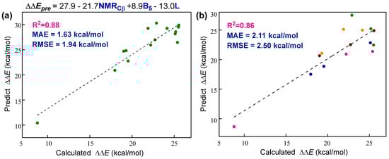 (a) Application of stepwise regression analysis of ΔG≠. (b) Plot of computed vs. predicted ΔG≠ for external verification.