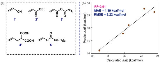 To assess the extrapolation capability of the model, external data sources distinct from the initial data sets were employed for comparison and validation, as depicted in Figure 6. Five polar monomers (Figure 6a), labeled as 1′–5′ and not included in the initial training set, were selected for this external validation, and the parameter values for the three descriptors were compiled in Table S3. As shown in Figure 6b, the model demonstrated robust performance on these monomers, with an R2 of 0.91, an RMSE of 1.89 kcal/mol, and an MAE of 2.22 kcal/mol, indicating strong extrapolation capabilities.
