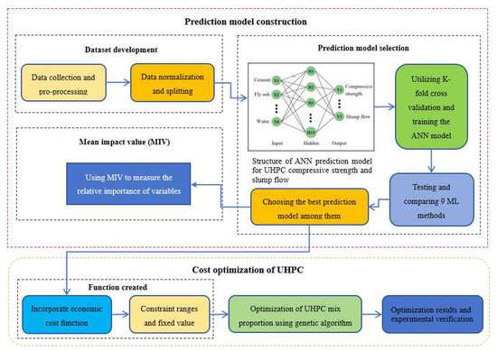 Figure 1 shows the flowchart of the whole framework of this research, which can be categorized into two stages: the first one is the prediction model construction and the other one is the establishment of the cost-optimization model. This research first establishes a prediction model for the 28-day compressive strength and slump flow of UHPC using ANN. The prediction performance of nine distinct ML methods is compared. Taking the 28-day compressive strength, slump flow, component content, component proportion, and absolute volume as constraints, the UHPC mix ratio with the lowest cost is obtained through GA optimization. Finally, sensitivity analysis is conducted to evaluate the importance of each raw material in UHPC on its performance. The purpose of this research is to explore the effect of GO on the properties of UHPC and obtain the lowest cost ratio through ML under the condition of meeting the engineering requirements for concrete performance, thereby promoting the application of GO-modified UHPC.