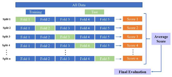 K-fold cross-validation (CV) was developed by Stone in 1974 and widely used in ML to select the appropriate hyperparameters [29]. K-fold CV is a commonly used model evaluation method. In K-fold CV, the original dataset is divided into k equal subsets, one of which is retained as the validation set, while the other k-1 subsets are used to train the model. This process is repeated k times, and each subset is used as a validation set. The final result is the average of k’s validation results. This method fully utilizes all data for training and validation; reusing these subsets to train and validate the model can reduce bias and variance issues caused by improper dataset partitioning and provide a more accurate estimate of the model’s generalization ability. Due to each sample being used as a validation set, the model will not overly rely on specific training validation segmentation, thereby reducing the risk of overfitting. The main process of the K-fold CV is displayed in Figure 3.
