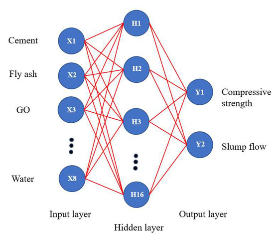 The relationship between the costs and raw materials was initially established using ANN. Next, the GA was utilized to improve the properties and cut expenses based on the pre-trained ANN model. ANN was used in this work to develop a UHPC performance prediction model. Cement, fly ash, GO, silica fume, fine aggregate, steel fiber, superplasticizer, and water made up the eight neurons in the input layer, designated X1 through X8 in that order. The neurons in the output layer are Y1 and Y2, which represent the UHPC’s 28 d compressive strength and slump flow. Using a trial-and-error approach, the hyperparameter of the number of hidden layer neurons was determined.