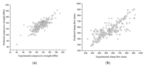 Among them, S is the predicted slump flow of fresh UHPC, and Sr is the required slump flow of fresh UHPC, which has to be chosen in accordance with the real engineering requirements. In this investigation, Sr is assumed to be 600 mm due to the fundamental working property of UHPC [62].